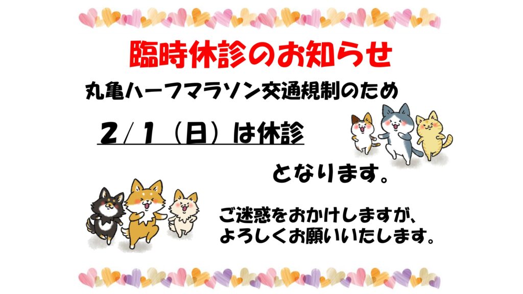 丸亀国際ハーフマラソンによる交通規制があるため、2月1日(日)は臨時休診いたします。